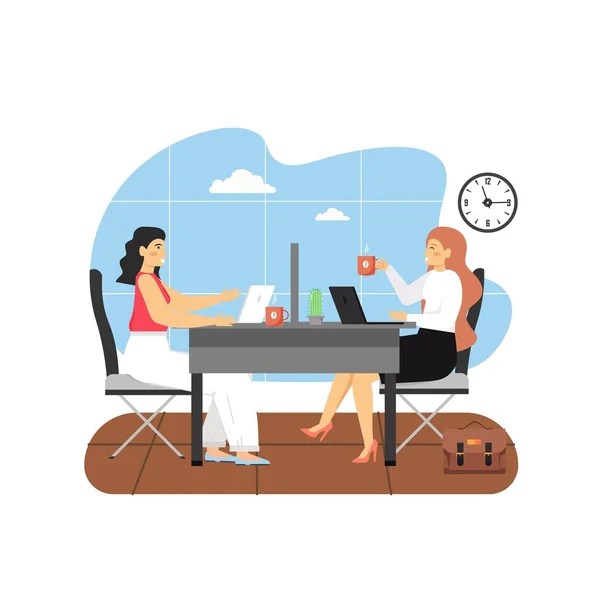 Adegan Kantor Dengan Tempat Kerja Modern Dua Perempuan Bekerja Sama Dan Minum Kopi Gambar Vektor Datar Stok Vektor C Skypistudio 404530648